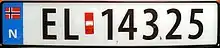 The current alphanumerical system (two letters followed by four or five numbers) was introduced in 1971. The design of the plates remained the same until 2002, when the road authorities decided on a new font which standardized the width of each character.[1] The new design was unsuccessful due to legibility issues, for example the letters "A" and "R" were often hard to distinguish. From 2006 the font was changed again to improve legibility, and space was provided for a blue nationality stripe with a Norwegian flag.[2] From 2009, plates were made of plastic, and produced in a factory at Tønsberg.[3] From 2012, plates are again produced in aluminum.[4]
