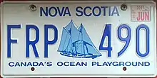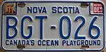 1989–2011 | Embossed blue serial on reflective white plate; border lines around plate and around top corners; light blue graphic of the Bluenose screened in the centre; "NOVA SCOTIA" screened in blue centred at top | "CANADA'S OCEAN PLAYGROUND" screened in blue at bottom | ABC 123 | BRT 001 to FAD 999 | Awarded "Plate of the Year" for best new licence plate of 1989 by the Automobile License Plate Collectors Association, the first and, to date, only time Nova Scotia has been so honored. Co-recipient with Oklahoma. |