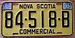 Commercial | 1978–2012 | Embossed black serial on yellow plate; border lines around plate and around top corners; "NOVA SCOTIA" and "COMMERCIAL" centred at top and bottom respectively | 12-345-A | 10-000-A to 37-519-D | Currently issued to commercial vehicles above 5,000 kg (11,000 lb). Passenger plates issued to lighter commercial vehicles since 1986.[4] |