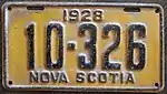 1928 | Embossed black serial on orange plate with border line; "1928" and "NOVA SCOTIA" centred at top and bottom respectively | 12-345 | 10-001 to approximately 27-500 | No letter prefix used for vehicles weighing 3,000 lb or less. |