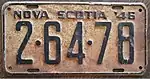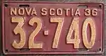 1936 | Embossed white serial on red plate; "NOVA SCOTIA 36" at top | 12-345 | Coded by county group (1) | |