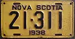 1938 | Embossed black serial on yellow plate; "NOVA SCOTIA" and "1938" centred at top and bottom respectively | 12-345 | Coded by county group (1) | |