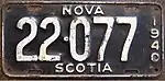 1947 | Embossed white serial on black plate with border line; "NOVA SCOTIA '47" at bottom | 1-23-45 | Coded by county group (1) | |