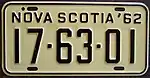 1962–63 | Embossed black serial on light yellow plate with border line; "NOVA SCOTIA '62" at top | none | 1-23-45 12-34-56 |
