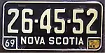 1969–71 | Embossed yellow serial on black plate; border lines around plate and around bottom corners; "NOVA SCOTIA" centred at bottom; "69" at bottom left | none | 1-23-45 12-34-56 |