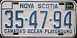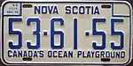 Antique Auto | Embossed blue serial on white plate; border lines around plate and around top corners; "NOVA SCOTIA" and "CANADA'S OCEAN PLAYGROUND" centred at top and bottom respectively, "ANTIQUE AUTO" on left side of number. | 1234 | 0001 to 9999 | ||