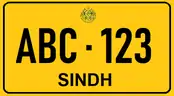 Plates are yellow with embossed black letters and numbers. The plates consist of three letters and three numbers with the Sindh coat of arms above. Sindh is written above only. Plates start with alphabets (beginning with AAA) followed by a string of numbers (beginning with 001). | |