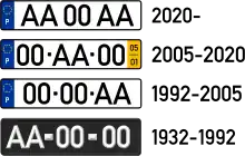 In 2020 with the change to the AA–01–AA, the yellow ribbon containing the date of first registration is being discontinued due to authorities in other countries mistaking the registration date as an expiration date.[1] In addition, the dashes that separate each block of numbers or letters have been removed from the new plate format. Owners of vehicles that need replacement plates will be able to choose whether such plates are produced according to either the old or new format.