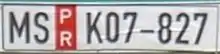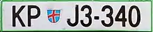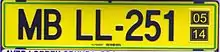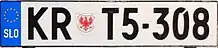 Slovenian car number plates are vehicle registration plates found on Slovenian cars. The code for Slovenia itself is SLO.[1] The registration plates are made of metal. On the left there is a blue bar as in other EU countries (in use since 2004) along with tamper-proof text up to 2008; the text is in black letters on a white background in Helvetica typeface. In 2008 the plates reverted to a green border used before 2004 and the old font but retaining the EU border at the left. Two plates must be present on each car - one at the front and one at the rear. In the case of motorcycles, only one plate is needed on the back of the vehicle. These plates can have different sizes, being the regional code in the first line, at the top. [2]