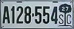 1927 | Embossed green serial on white plate with border line; "SC" at right, with letters separated by embossed Sabal palmetto containing debossed "27" | none | A123-456 | Letter corresponds to weight class | |