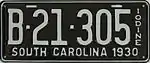 1930 | Embossed white serial on black plate with border line; "SOUTH CAROLINA 1930" at bottom | Vertical "IODINE" at right | A-12-345 | Letter corresponds to weight class | The slogan referred to the high amounts of iodine found in South Carolina's produce. Similar slogans were used through 1933. |