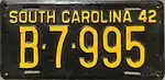 1941–42 | Embossed golden yellow serial on black plate; "SOUTH CAROLINA 42" at top | none | A·12·345 | Letter corresponds to weight class | |