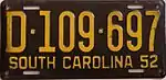 1952 | Embossed yellow serial on black plate; "SOUTH CAROLINA 52" at bottom | none | A·123·456 | Letter corresponds to weight class | |