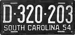 1954 | Embossed white serial on black plate; "SOUTH CAROLINA 54" at bottom | none | A·123·456 | Letter corresponds to weight class | |