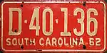 1962 | Embossed white serial on red plate with border line; "SOUTH CAROLINA 62" at bottom | none | A-123456 | Letter corresponds to weight class | |