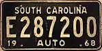 1968 | Embossed white serial on black plate with border line; "SOUTH CAROLINA" and "AUTO" centered at top and bottom respectively; "19" at bottom left and "68" at bottom right | none | A 123456 | Letter corresponds to weight class | |