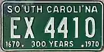 1970 | Embossed white serial on green plate with border line; "SOUTH CAROLINA" at top | "300 YEARS" centered at bottom, with "1670" to the left and "1970" to the right | A 123456 AB 1234 |