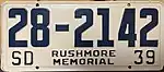1939 | Embossed blue on white; "SD" at bottom left and "39" at bottom right | "RUSHMORE MEMORIAL" at bottom center | 1-1234 10-1234 |