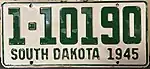 1945 | Embossed green on white with border line; "SOUTH DAKOTA 1945" at bottom | none | 1-1234 10-1234 |