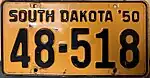 1950 | Embossed black on orange with border line; "SOUTH DAKOTA '50" at top | none | 1-1234 1-A123 10-123 10-A12 10-1A2 10-12A |