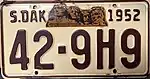 1952 | Embossed maroon on beige with border line; "S.DAK", Mount Rushmore decal and "1952" at top | none | 1-1234 1-A123 10-123 10-A12 10-1A2 10-12A |