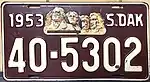 1953 | Embossed beige on maroon with border line; "1953", Mount Rushmore decal and "S.DAK" at top | none | 1-1234 1-A123 10-1234 10-A123 |