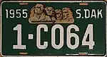 1955 | Embossed white on green with border line; "1955", Mount Rushmore decal and "S.DAK" at top | none | 1-1234 1-A123 10-1234 10-A123 |