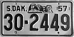1957–59 | Embossed black on reflective white with border line; "S.DAK.", stamped Mount Rushmore graphic and "57" at top | none | 1-12345 10-1234 |