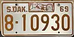 1969 | Embossed orange on reflective white with border line; "S.DAK.", stamped Mount Rushmore graphic and "69" at top | none | 1-12345 10-1234 |