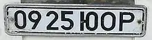The license plates are black-on-white. The standard format is four digits followed by Cyrillic letters ЮОР (Юго-Осетинская Республика, Russian for South Ossetian Republic). This system provides just 9,999 possible combinations. Newer system uses format like in Russian license plates: One letter, three digits and two letters with South Ossetian country flag and country code "RSO" in it. Government vehicles uses three digits and three letter format.