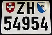Vehicle license plates of Switzerland, are composed of a two-letter code for the canton and a number with up to 6 digits. The rear plates also display two shields with the flags of Switzerland and the respective canton. Since 1972, the sizes of the plates have been 300 x 80 mm (front) and 300 x 160 mm (rear). In 1987, the optional long format rear plates of 500 x 110 mm, which had been abolished in 1972, were reintroduced.[1]