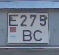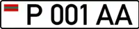 Standard license plates of Transnistria are 520 mm wide and 112 mm high, made of metal with 6 embossed characters - one letter, three numbers and two more letters - written using the DIN 1451 Mittelschrift font. On the left part of the plates there is also a modified euroband on a white background, having the flag of the PMR instead of the EU symbol. A holographic sticker in the place of the international country code underneath it was placed until 2015, when a law was revised, additionally removing black separation line between euroband and registration number;[1] instead, two interpolated grey sine waves were added on the bottom of the plate. Government plates only have 5 embossed characters - three numbers and two letters. Only symbols that are common to both the Cyrillic and the Latin alphabets are used, and with their Cyrillic meaning (A, B, C, E, H, K, M, P, T, X, Y). Its current design derives from Moldovan plates of 1992 design, but is slightly changed. Military plates are using Soviet design from 1959, and tractor plates are also using Soviet design, but from 1980.