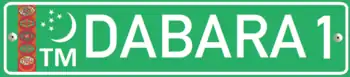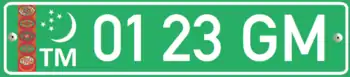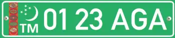 Government plates are green with silver characters arranged in the following format: ## ## XXX – where # is any digit between 0 and 9, and X is a letter from the Latin alphabet. An example of a governmental plate issued in the capital, Ashkhabad, would look like this: 00 33 AGA. Unusually, all the characters are rendered in the typeface formerly used on French registration plates.[2]