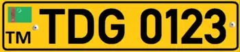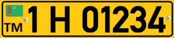 Plates issued to foreign nationals or companies residing in Turkmenistan resemble closely those found in Azerbaijan. They feature black alphanumerics rendered in DIN 1451 on a yellow background, and take the form of: #H ##### (e.g. 2H 50035).