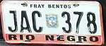 Río Negro Department—Fray Bentos city | JAB 123 | black on white | "FRAY BENTOS" at top, "RIO NEGRO" in orange band at bottom |