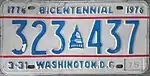 April 1, 1974 – March 31, 1978 | Embossed blue serial on reflective white plate; embossed blue U.S. Capitol dome graphic used as separator; screened red stripes above and below serial; "WASHINGTON, D.C." centered at bottom; "3-31" at bottom left and debossed sticker box at bottom right | "1776 BICENTENNIAL 1976" at top | 123-456 | 100-001 to 500-000 | Monthly staggered registration introduced August 1, 1983. All plates replaced between 1984 and 1986. |