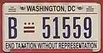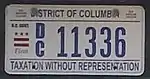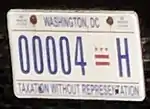 Since November 2000, the standard Washington, D.C. license plate design has featured some form of the slogan "Taxation Without Representation", referring to the unique circumstance that the district's residents face, in which they must pay federal income tax but cannot elect a voting member of the United States Congress.[5]