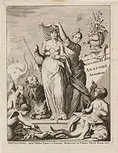 The frontispiece to Gerhard Blasius's 1681 book Anatome Animalum, engraved by Jan Luyken, was the first depiction of a many-breasted Isis-Artemis figure with her veil being removed. It shows a personification of science removing the veil, as an allegory for the way science uncovers nature's secrets. This metaphor was reused in the frontispieces of many of Antonie van Leeuwenhoek's works, and then in illustrations to other scientific works throughout the 18th century. In some cases the veiled figure is a statue, reminiscent of the original statue of Artemis at Ephesus, while in others it is a living woman. The motif was sometimes elaborated with other metaphors, so that, for example, in the frontispiece to The Philosophy of Nature by Jean-Baptiste-Claude Delisle de Sales, Nature unveils herself to a philosopher as he overthrows Despotism and Superstition. The unveiling of the Isis-figure thus expressed the hope, prevalent during the Age of Enlightenment, that philosophy and science would triumph over unreason to uncover nature's deepest truths. This motif continued beyond the Enlightenment into the 19th century. An example is Louis-Ernest Barrias's 1899 sculpture Nature Unveiling Herself Before Science, in which the multiple breasts are omitted and the figure of Nature wears a scarab on her gown that hints at her Egyptian connections.[9]
