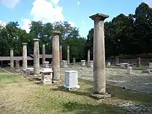 Veleia is an ancient town of Aemilia, Italy, about 15 km (9 mi) south of Placentia. It is mentioned by Pliny among the towns of the eighth region, though the Veleiates were ethnically Ligurians. Its inhabitants were, in the census of Vespasian, found to be remarkable for their longevity. Nothing further was known of it until 1747, when some ploughmen found the Tabula alimentaria, now in National Archaeological Museum of Parma.[1] This, the largest inscribed bronze tablet of antiquity (1.3 m by 2.8 m) contains the list of estates in the territories of Veleia, Libarna, Placentia, Parma and Luca, in which Trajan had assigned before 102 CE 72,000 sesterces and then 1,044,000 sesterces on a mortgage bond to forty-six estates. The total value of which was reckoned at over 13,000,000 sesterces (~130,000), the interest on which at 5% was to serve for the support of 266 boys and 6 girls, the former receiving 16, the latter 12 sesterces a month.[2][3]