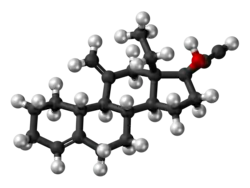 Desogestrel, also known as 3-deketo-11-methylene-17α-ethynyl-18-methyl-19-nortestosterone or as 11-methylene-17α-ethynyl-18-methylestr-4-en-17β-ol, is a synthetic estrane steroid and a derivative of testosterone.[14][45][46] It is more specifically a derivative of norethisterone (17α-ethynyl-19-nortestosterone) and is a member of the gonane (13β-ethylgonane or 18-methylestrane) subgroup of the 19-nortestosterone family of progestins.[14][47][48] Desogestrel is the C3 deketo analogue of etonogestrel and the C3 deketo and C11 methylene analogue of levonorgestrel.[14][49]