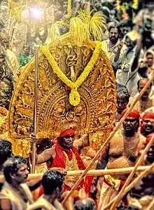 The festival, Kaliyoottu, ended with a grand procession knows as Aaraattu.[19] During Aaraattu the Idol is cleaned using water collected from 101 pots.[20] Aaraattu is conducted at vellayani lake. A girl from the priest family below ten years of age, along with chief priest performs the function.[21]