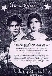 Vellinakshatram is a 1949 Indian Malayalam-language[1] feature film directed by Felix J. Beyse and produced by Udaya Pictures.[2][3] Starring Gayaka Peethambaram, Miss Kumari, Lalitha Devi, Alleppey Vincent, Kandiyoor Parameshwaran Pillai and Baby Girija. It was the first production of Udaya Pictures.[4] It had music composed by B. A. Chidambaranath, who debuted with this film.[5]