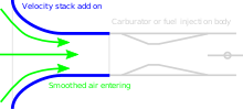 A velocity stack', 'trumpet, or air horn,[1] is a trumpet-shaped device of differing lengths which is fitted to the air entry of an engine's intake system, carburetor or fuel injection.