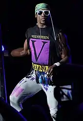After getting signed to a developmental contract, Clark initially debuted at NXT house shows with the gimmick of a Donald Trump supporter, wearing shirts with Trump's image and the "Make America Great Again" slogan. In 2017, he adopted the persona of Velveteen Dream, a character inspired by the musician Prince. The character was described by WWE as a "mysterious yet intoxicating presence [...] sporting a frilled, jewelled look that would have fit right in onstage during Prince's Purple Rain Tour".[2] Clark described the character as "a sexually ambiguous, genderfluid, self-absorbed diva".[50] As Velveteen Dream, his finishing move was the Purple Rainmaker, a diving elbow drop with a name also inspired by Prince.[lower-alpha 1]