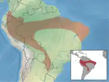 It is found in northern and western Brazil, southern Colombia, eastern Ecuador and Peru, and in Bolivia, Paraguay, and northwestern Argentina.[4] It inhabits lowland forest and savannah habitats, close to bodies of fresh water.[2] No subspecies are currently recognised, although a possible subspecies, or even full species, has been proposed for Bolivian specimens.[5]