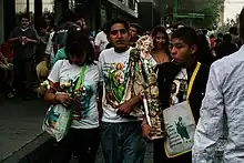 The church is one of few which allows mass participation by drug addicts and those who have had problems with the law.[2][6] Located in the Cuauhtémoc borough of Mexico City, with high crime rates, most who visit this church are poor, marginalized and young, generally between thirteen and twenty years of age.[2][5] Most are also male although groups of females can be seen, and most of the young people attend with their group or gang (called “bandas” in Mexican Spanish).[2][6] On the 28th of each month, masses are held in honor of this saint, which bring people to the church from all over the city.[1] Most use public transportation but some will walk the entire way to the church, starting the night before.[11] Most attendees have images of the saint with them from their homes, which can be anywhere from 20 cm to over a meter and a half in height, made of various materials.[2][3] Those with small children sometimes dress them as the saint.[3][5] Many devotees also carry red and white roses.[12] For this monthly event, police are assigned to the area around the church, mostly to redirect traffic.[13]