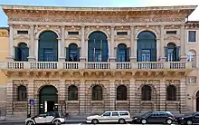 Jacopo Sansovino (1486–1570), also an important sculptor, was a Florentine with a successful career in Florence and then Rome. He fled to Venice after the catastrophic Sack of Rome in 1527 and in 1529 was appointed chief architect and superintendent of properties (Protomaestro or Proto) to the Procurators of San Marco.[25] According to Manfredo Tafuri, his first project in Venice, Palazzo Gritti, was never built as his plans, though brilliant, were considered too full of exhibitionist novelties; he had failed to grasp the ideology of the sober and restrained magnificence required by Venetian patricians.[26] However, his plan to stabilize the domes of San Marco, which had long given trouble, by wrapping iron bands around them, "made his reputation".[27] Before long he found a style that satisfied Venetian patrons and was "definitive for the entire subsequent history of Venetian architecture".[28] He created the appearance of much of the area around the Piazza San Marco beyond Basilica of San Marco itself, designing the Biblioteca Marciana (1537 onwards) and mint or "Zecca" on the Piazzetta di San Marco. His palazzi include Palazzo Corner della Ca' Grande (1532 onwards) and Palazzo Dolfin Manin from 1536.[29]