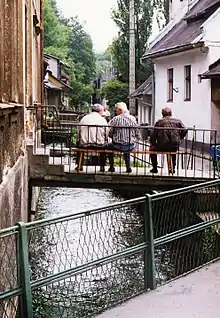 Venice of Cieszyn (Polish: Cieszyńska Wenecja) is a part of the Old Town in Cieszyn, Poland. It is a section of contemporary Przykopa Street (formerly Nad Młynówką) which comprises buildings from the 18th-19th century, many of them with bridges over the course of Młynówka (an artificial canal).[1] In the past the buildings over Młynówka belonged to craftsmen: tanners, weavers, clothiers, leather-dressers and smiths, who needed constant access to water for their craft.[2] It is the area between the intersection of Przykopa Street and Jan Łyska Avenue and the corner of Przykopa and Schodowa streets.[3]