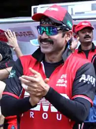 Venkatesh received five state Nandi Awards for Best Actor,[13] and six Filmfare Awards South in various categories. Venkatesh co-owns Suresh Productions;[14] one of the largest film production companies in India, under which he acted in several films.[15][16] He is also the mentor of the Telugu Warriors, representing Tollywood in the Celebrity Cricket League.[17]