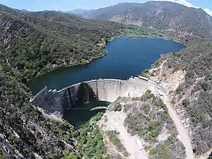The flow of the Ventura River and its tributary Coyote Creek have been reduced by the completion of Casitas Dam, which forms Casitas Reservoir. The dam is on Coyote Creek about 2 miles upstream of the junction with the Ventura River. The Robles Diversion Dam was constructed on the Ventura River in 1958 to divert up to 107,800 acre-feet of water per year through a four-and-a-half mile canal to Casitas Reservoir.[22] About 40% of the total water in Lake Casitas is supplied from high winter flows in the Ventura River. Casitas Municipal Water District sells water to both domestic and agricultural customers.[23]